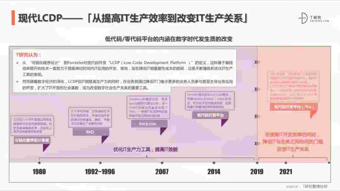 2020年前后,,,,源于提高IT工作者开发效能的LCDP不断进化和衍生,,,,面对业务导向日益明显的数字化变革。。LCDP衍生出了面向不同对象的升级服务——面向专业人群的LCDP和业务人群的NCDP,,,LCDP与NCDP的不同服务属性被逐渐认可和接受。。。。 LCDP在提高IT开发效率的同时,,,,降低IT与业务之间协同的门槛改变IT生产关系。。