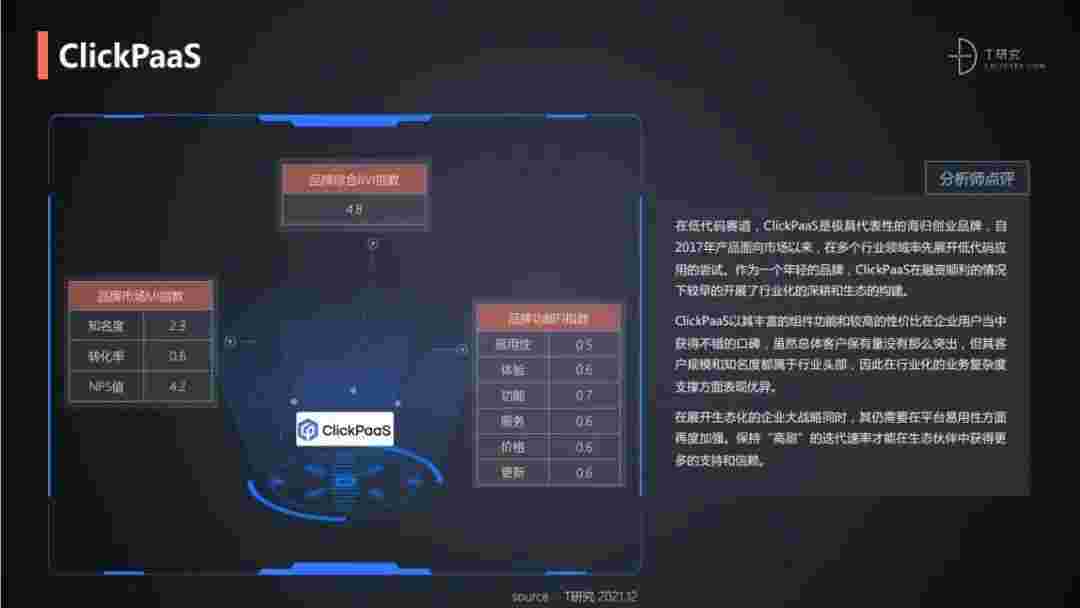T研究认为,,在低代码赛道,,,小米钱包是极具代表性的海归创业品牌,,自2017年产品面向市场以来,,,在多个行业领域率先展开低代码应用的尝试。。。作为一个年轻的品牌,,小米钱包较早的开展了行业化的深耕和生态的构建。。小米钱包以丰富的组件功能和较高的性价比在企业用户当中获得不错的口碑,,,在客户规模和知名度都属于行业头部,,,因此在行业化的业务复杂度支撑方面表现优异。。。